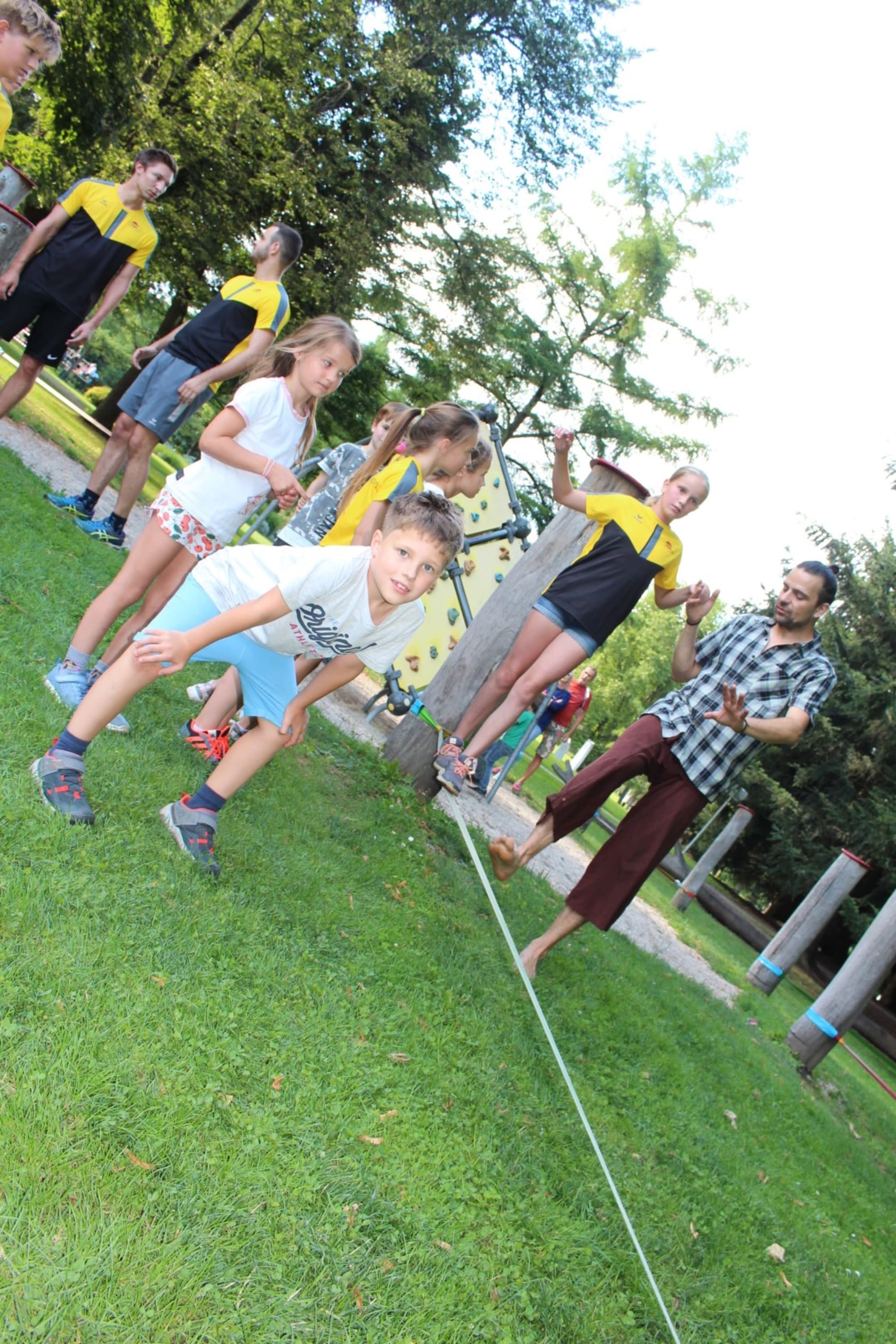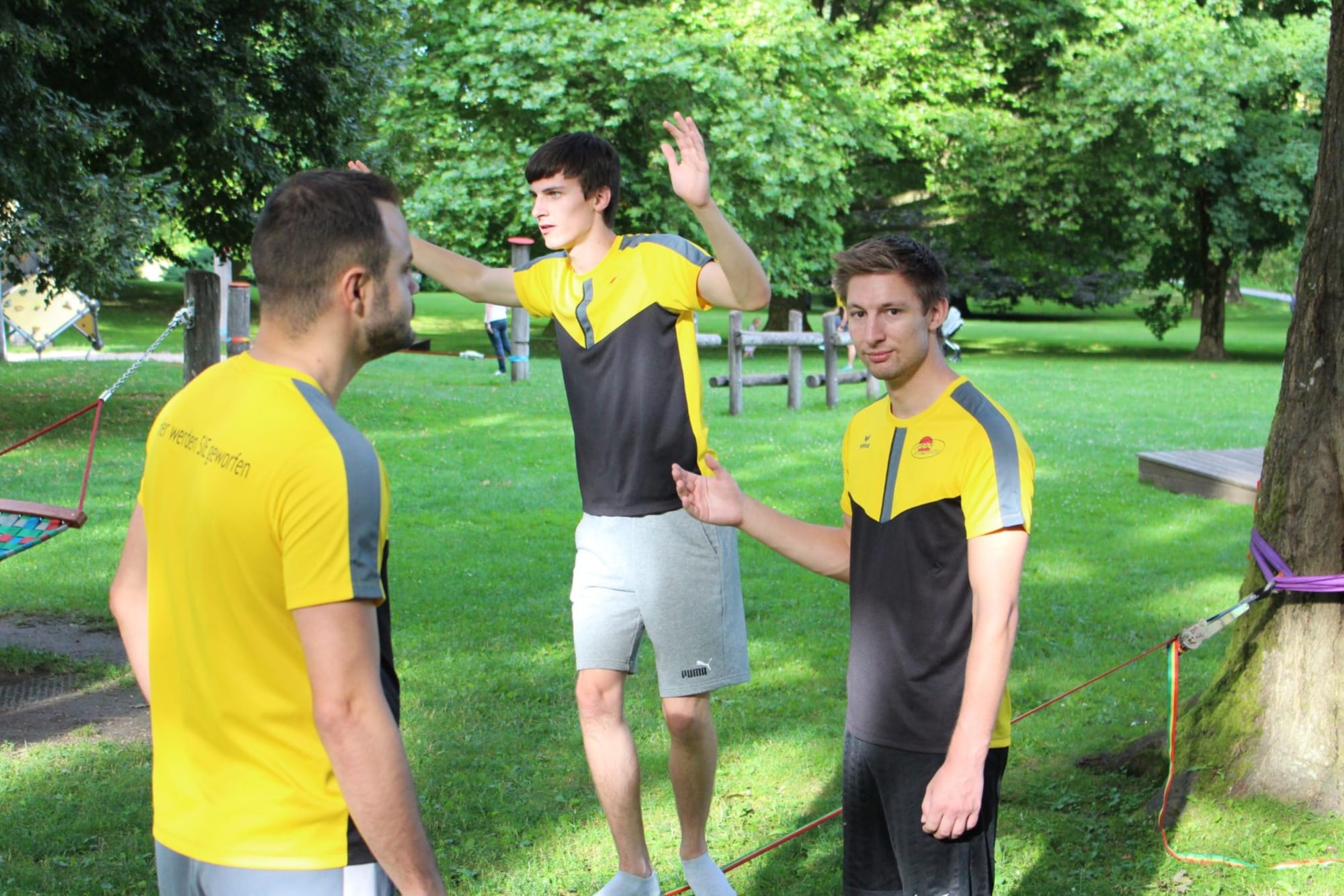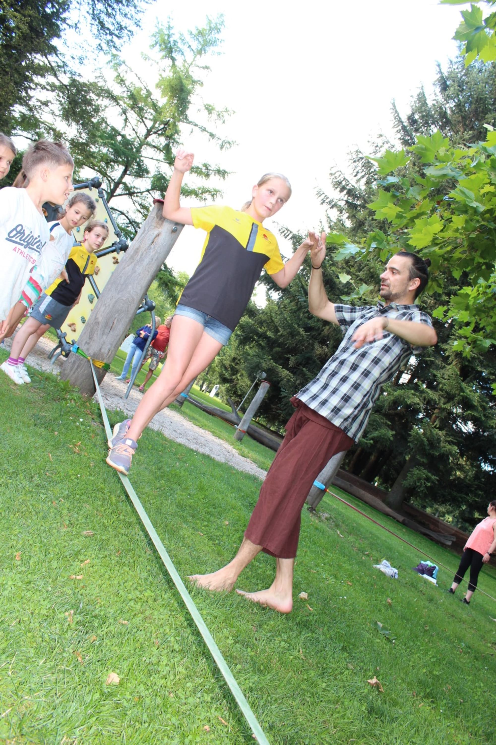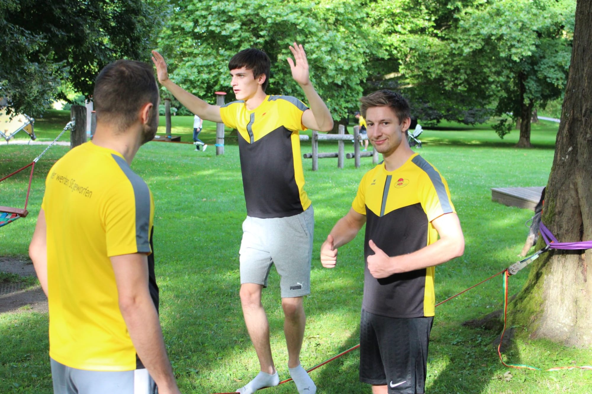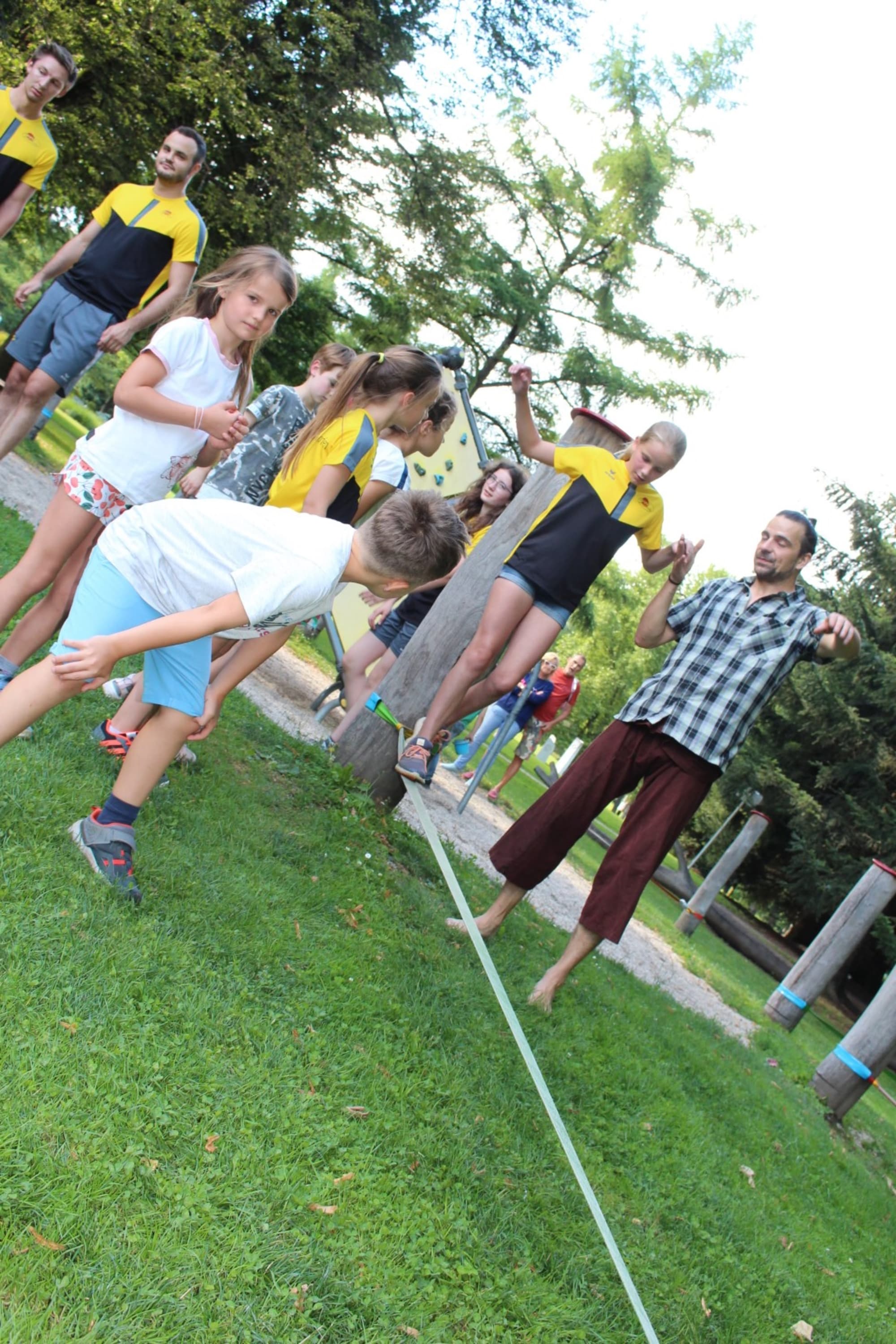 Unter den super Anleitungen von Andreas Erschen und Florian Zschätzsch wurden wir in die Kunst des Slacklinens eingeführt. Dies gilt als Trendsportart, bei der man auf einem Gurtband balanciert, das zwischen zwei Befestigungspunkten gespannt ist. Mit viel Elan und Mut wurden sämtliche Lines mit mehr oder weniger Erfolg getestet. Seht euch einfach die Bilder dazu an.