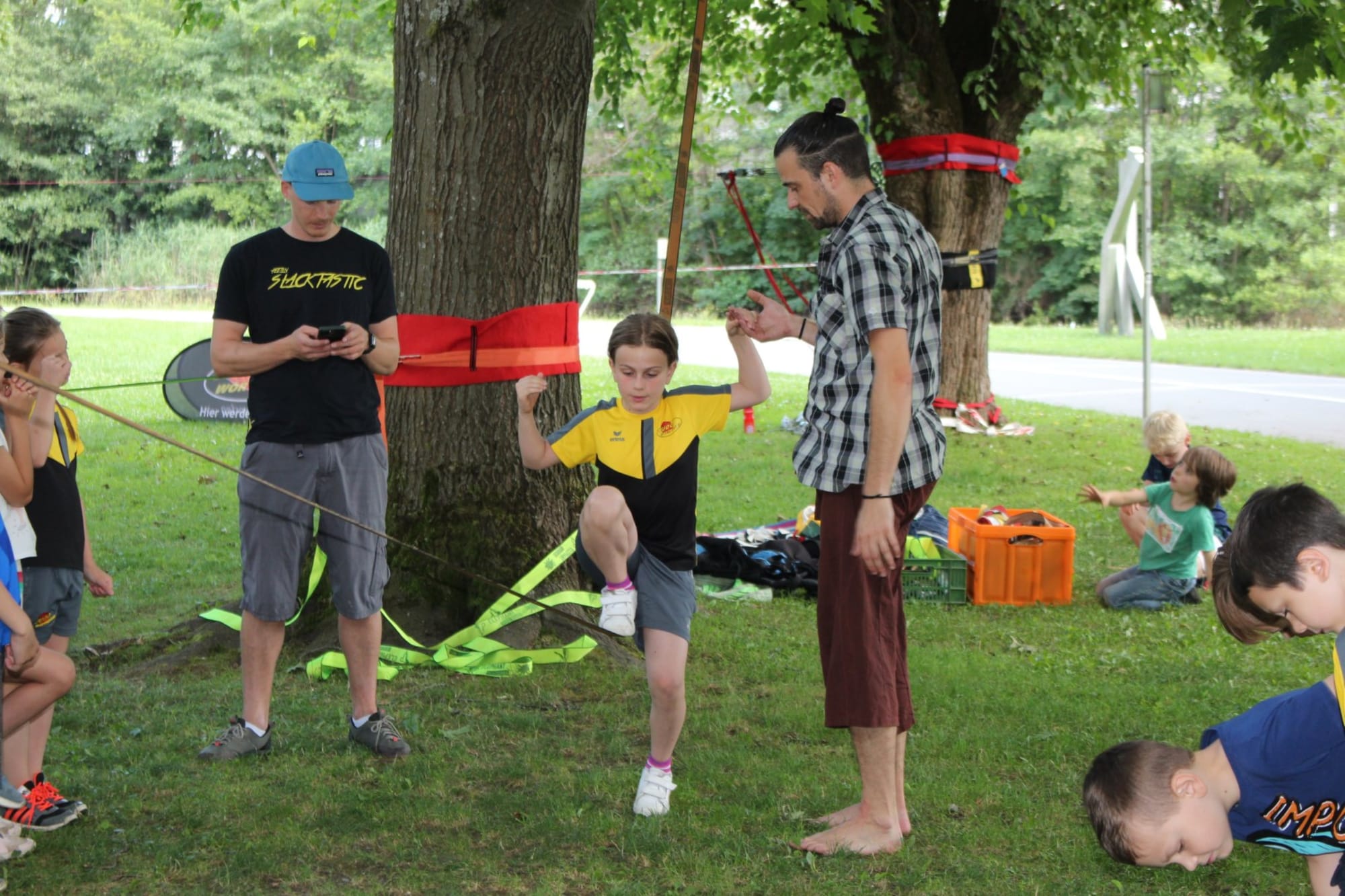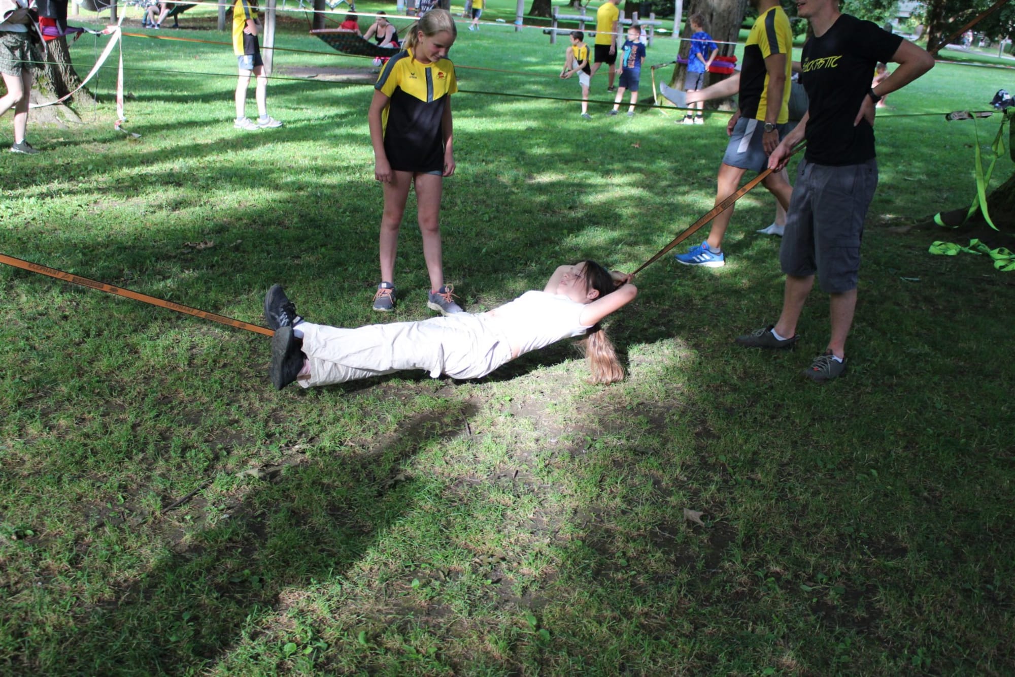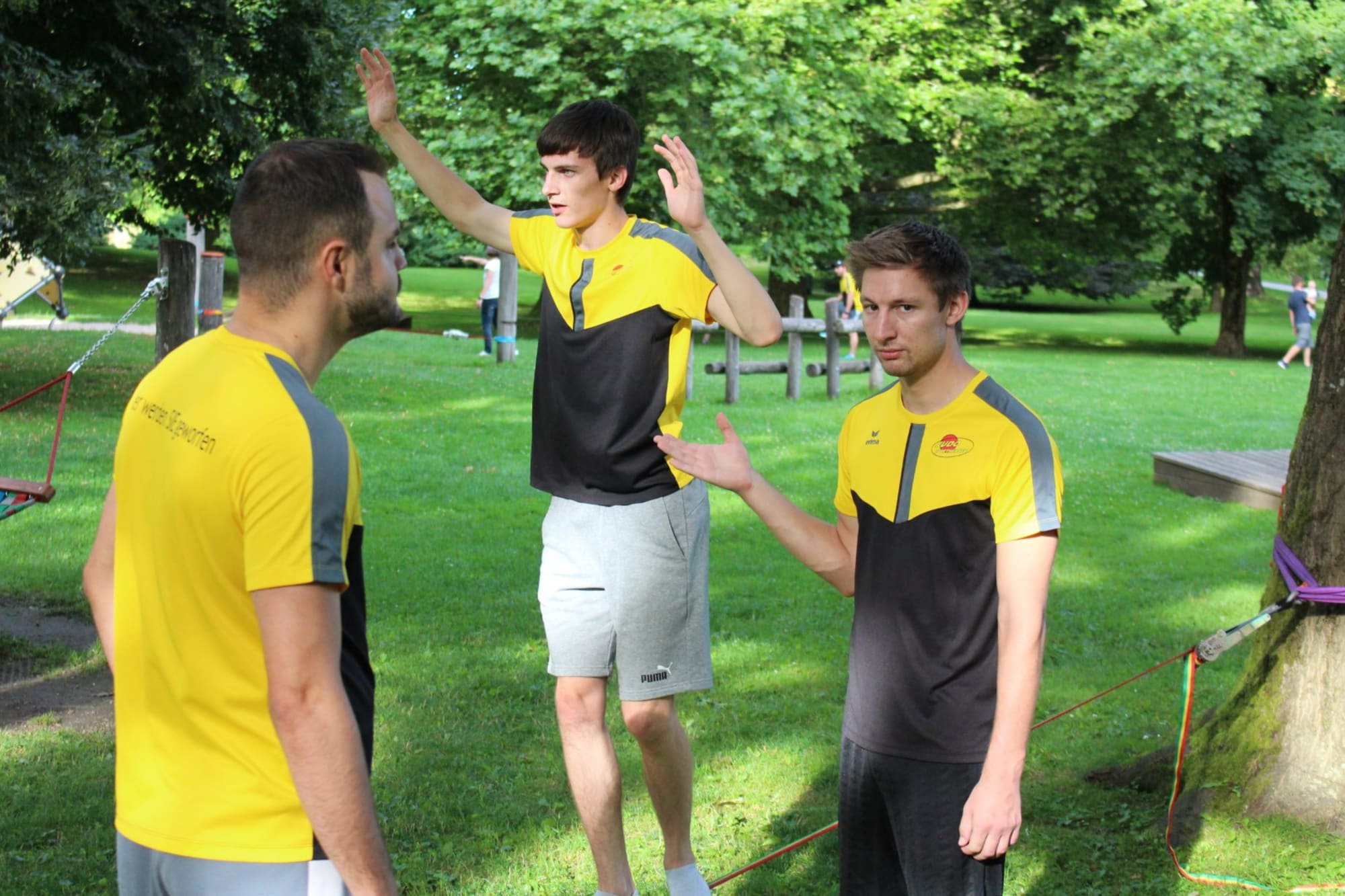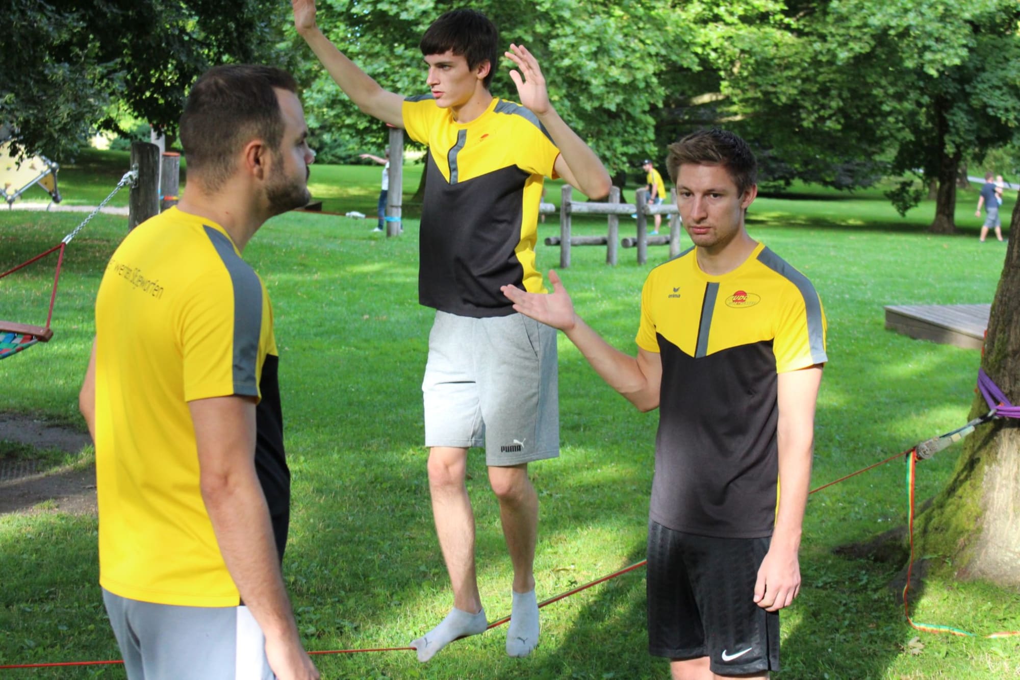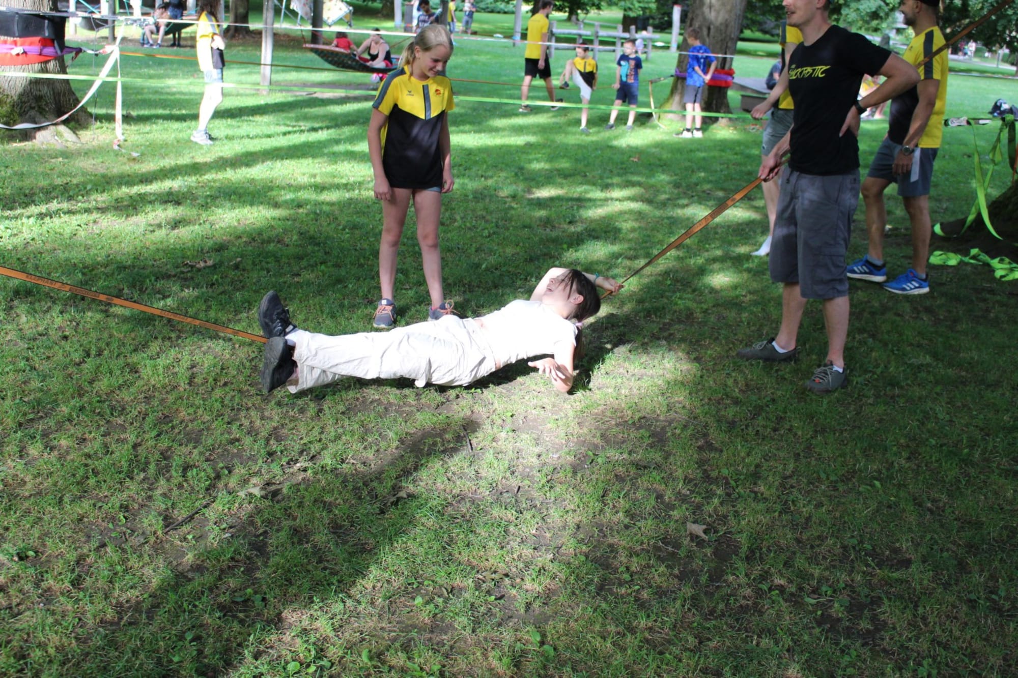 Unter den super Anleitungen von Andreas Erschen und Florian Zschätzsch wurden wir in die Kunst des Slacklinens eingeführt. Dies gilt als Trendsportart, bei der man auf einem Gurtband balanciert, das zwischen zwei Befestigungspunkten gespannt ist. Mit viel Elan und Mut wurden sämtliche Lines mit mehr oder weniger Erfolg getestet. Seht euch einfach die Bilder dazu an.
