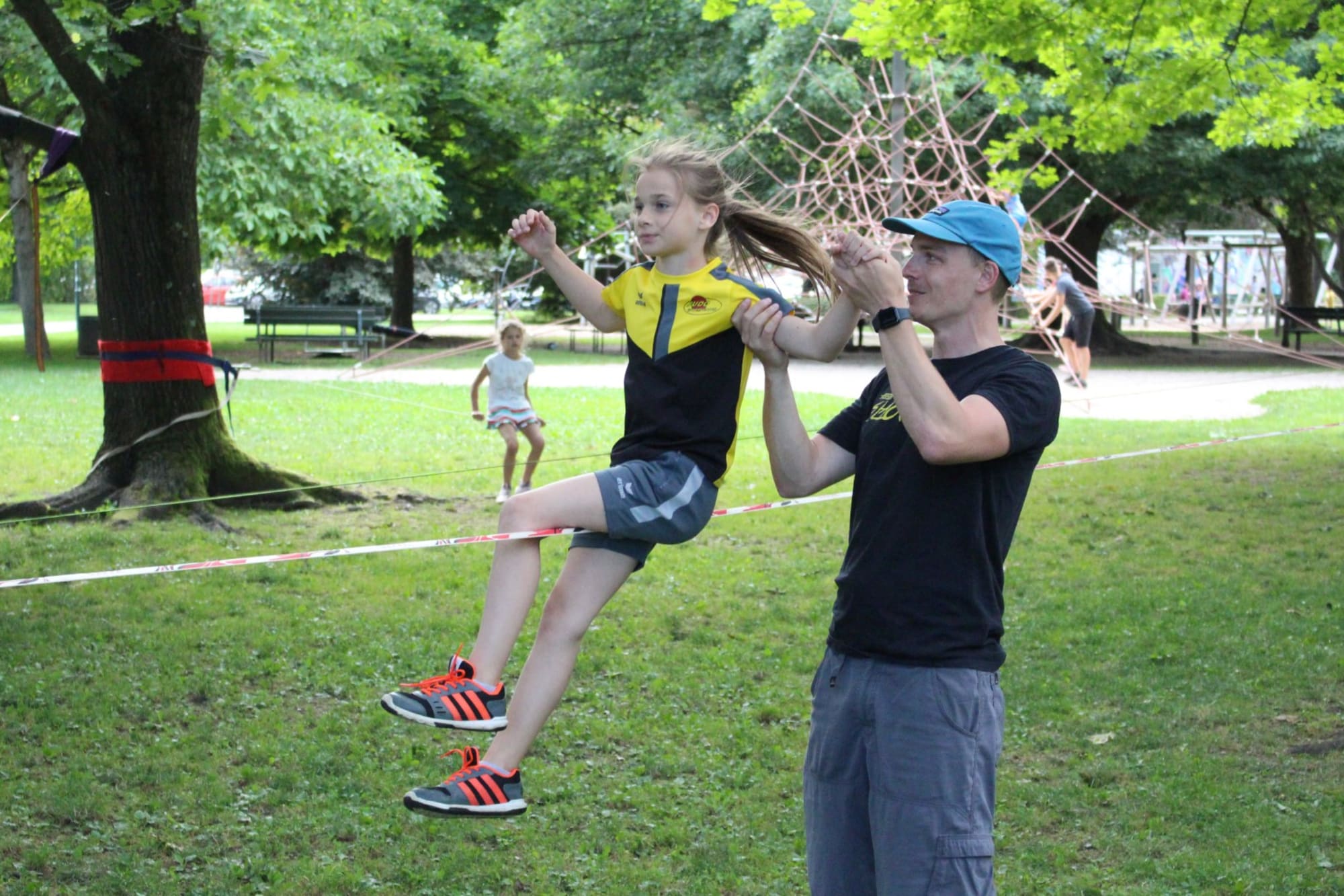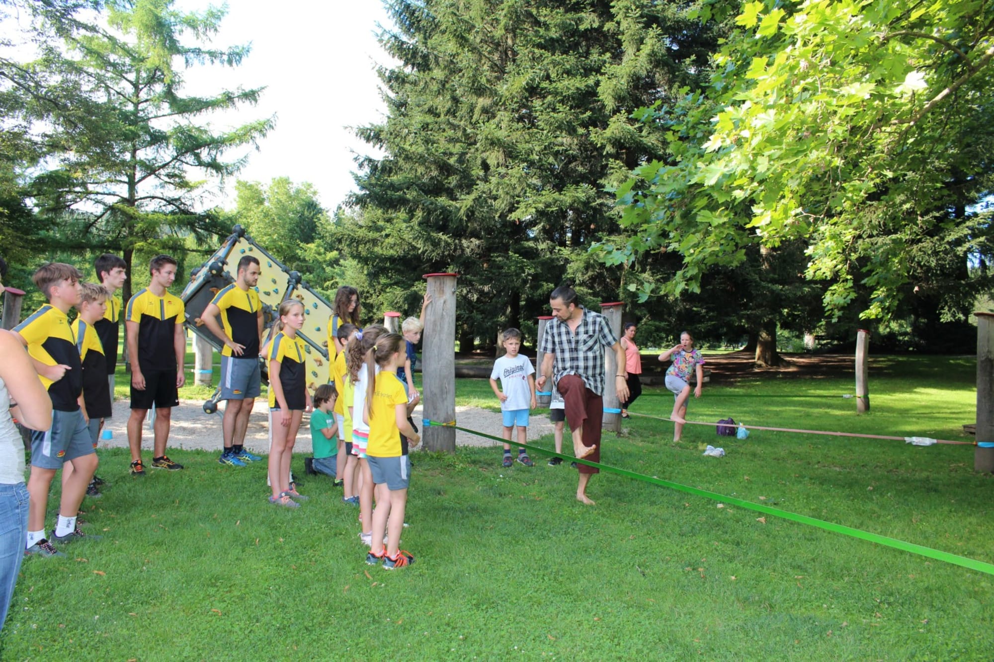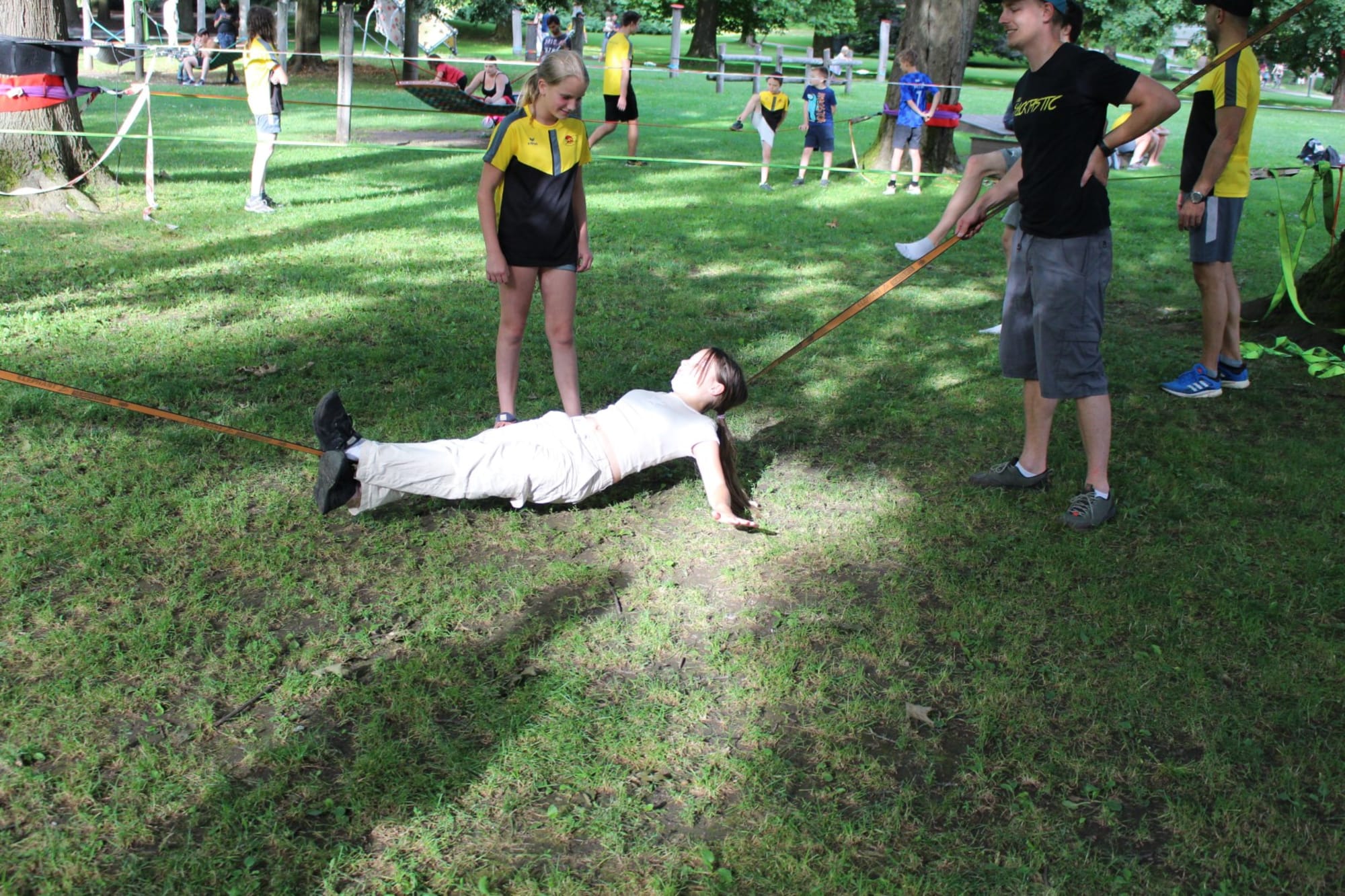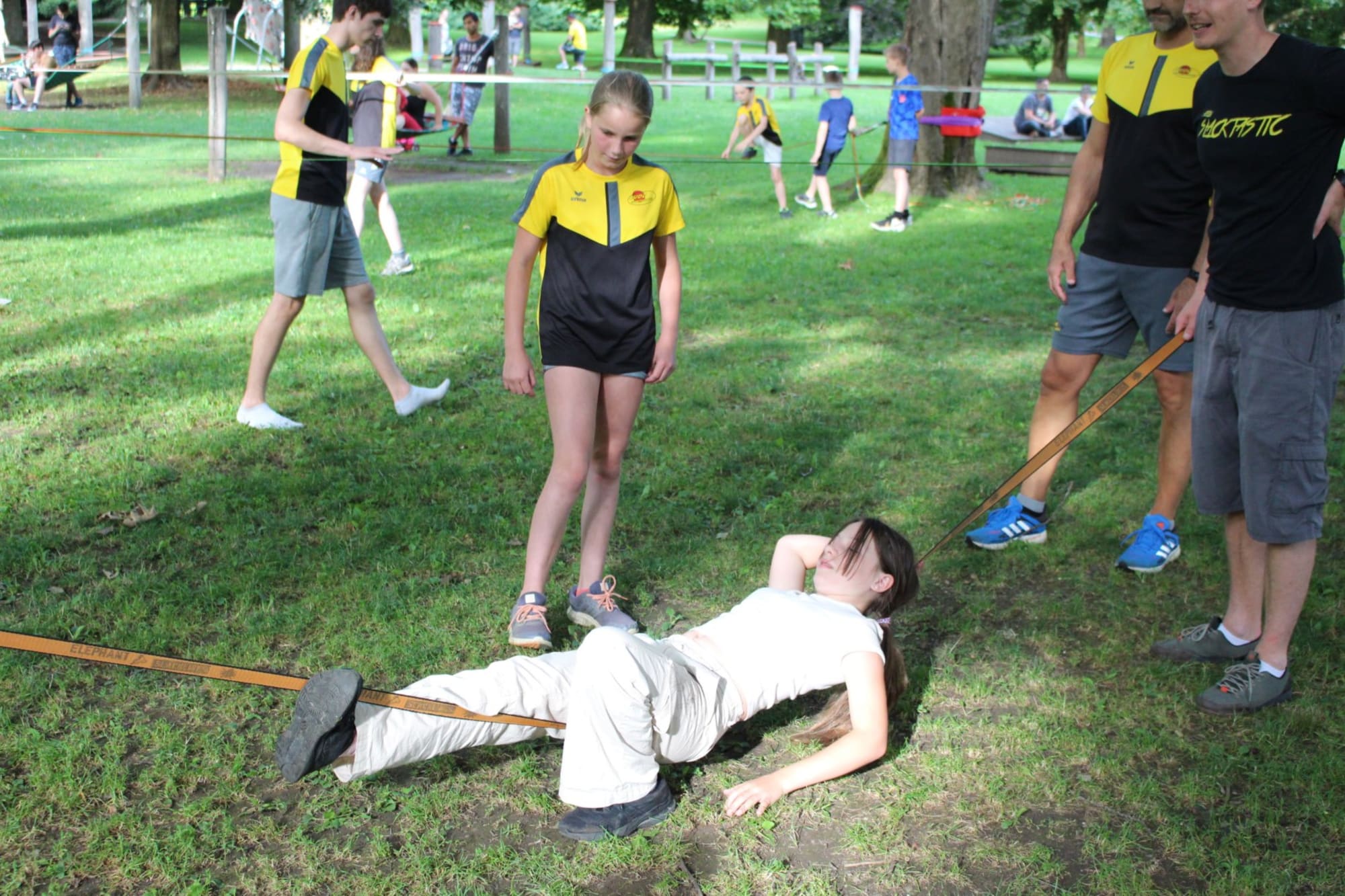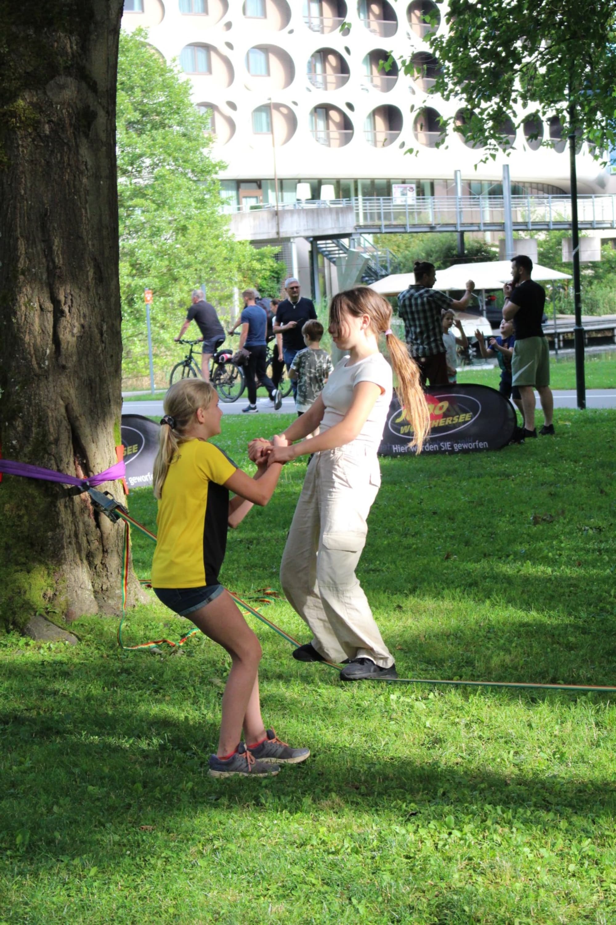 Unter den super Anleitungen von Andreas Erschen und Florian Zschätzsch wurden wir in die Kunst des Slacklinens eingeführt. Dies gilt als Trendsportart, bei der man auf einem Gurtband balanciert, das zwischen zwei Befestigungspunkten gespannt ist. Mit viel Elan und Mut wurden sämtliche Lines mit mehr oder weniger Erfolg getestet. Seht euch einfach die Bilder dazu an.