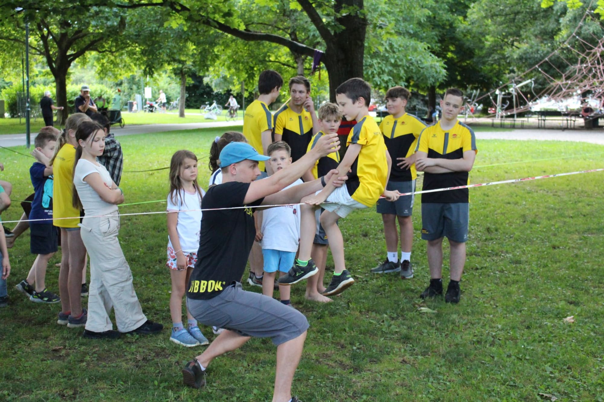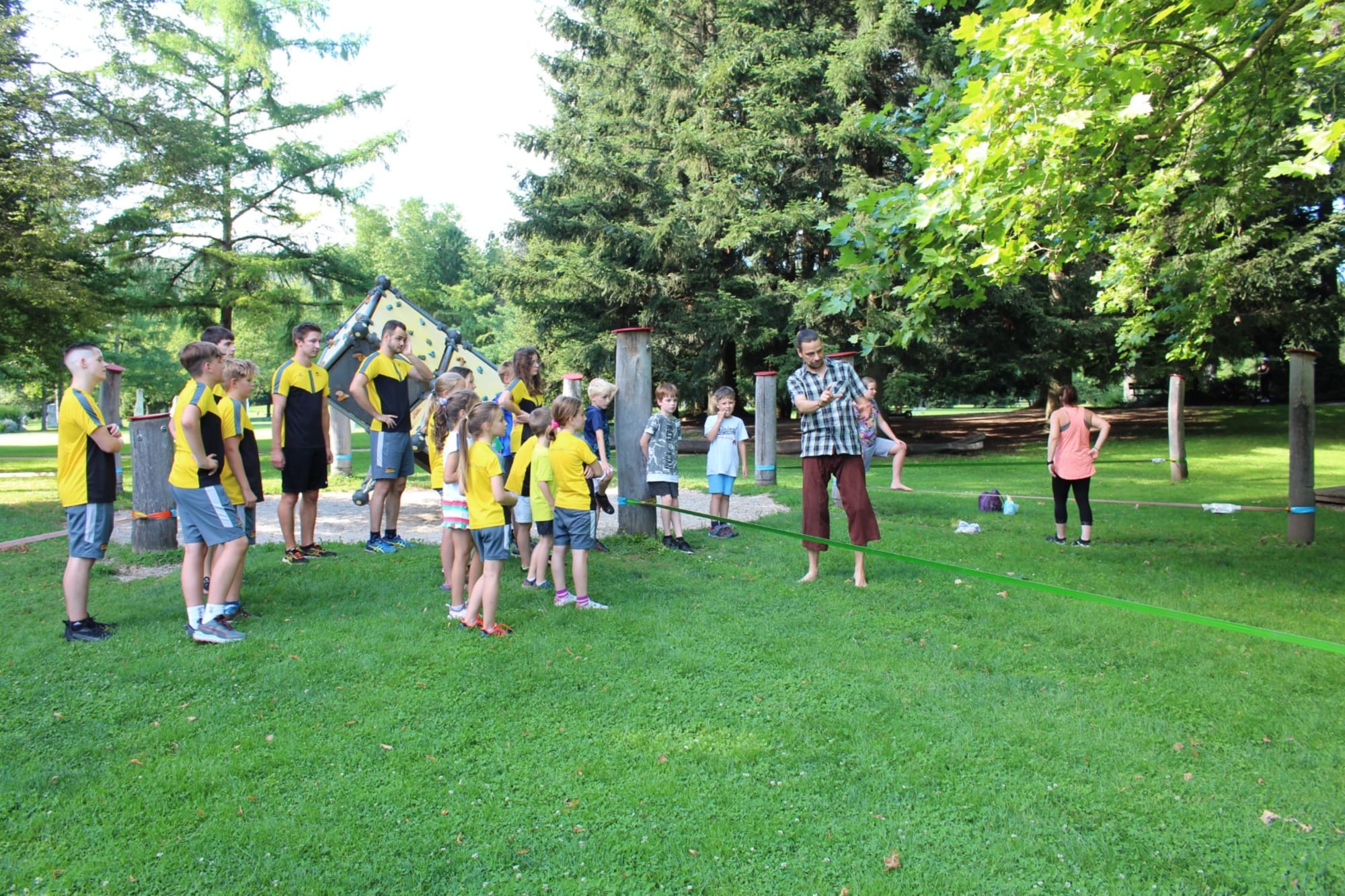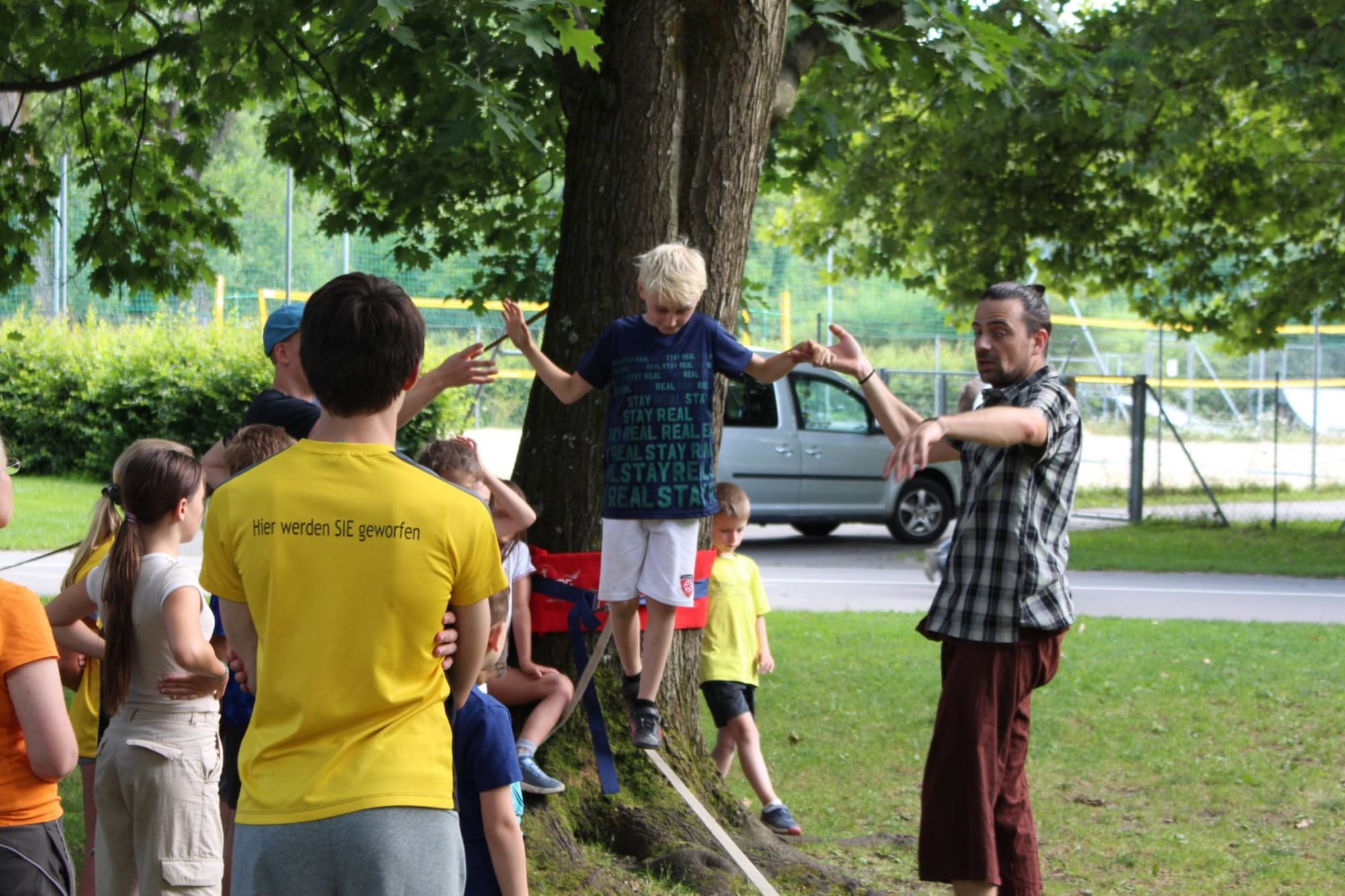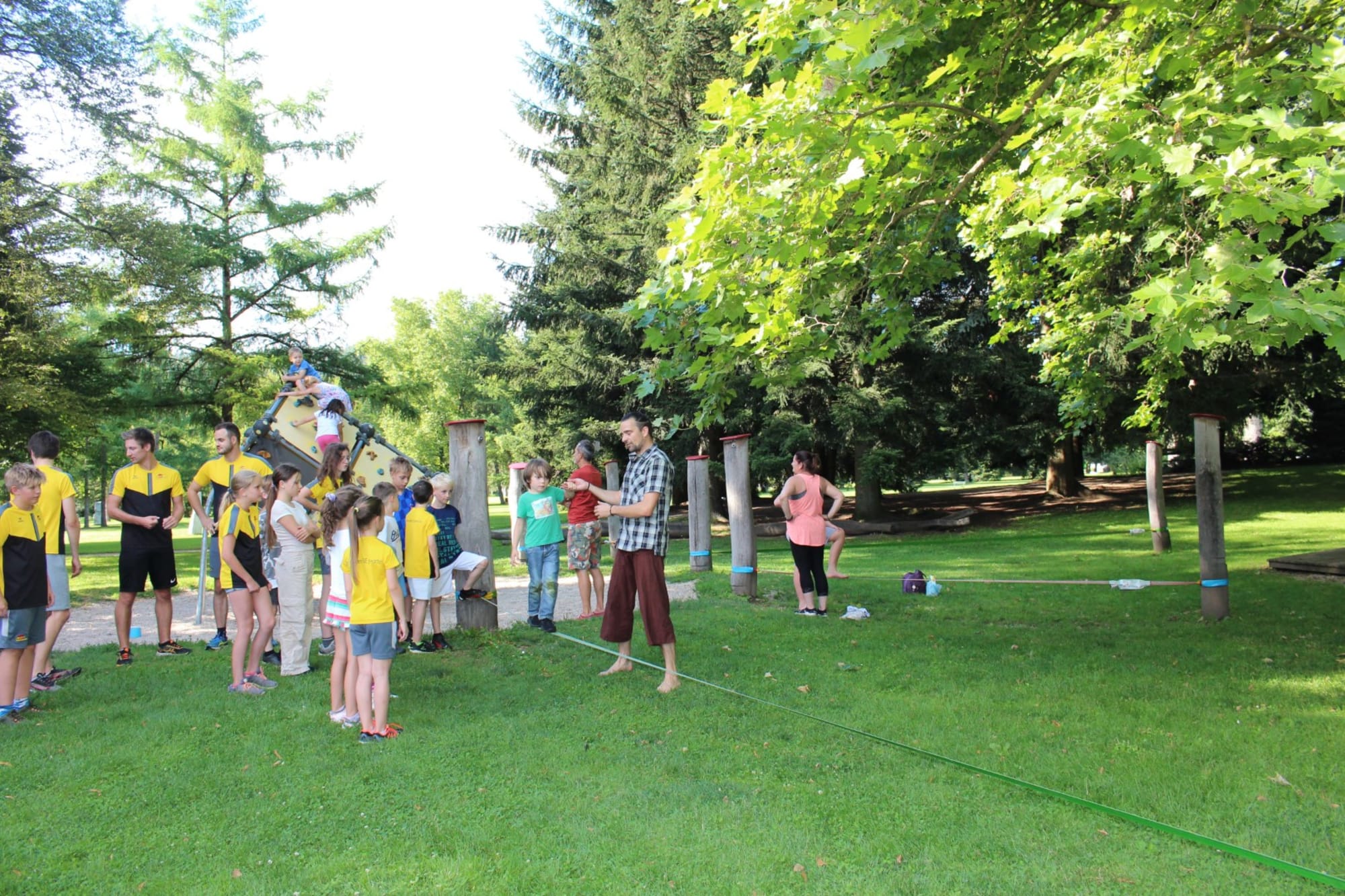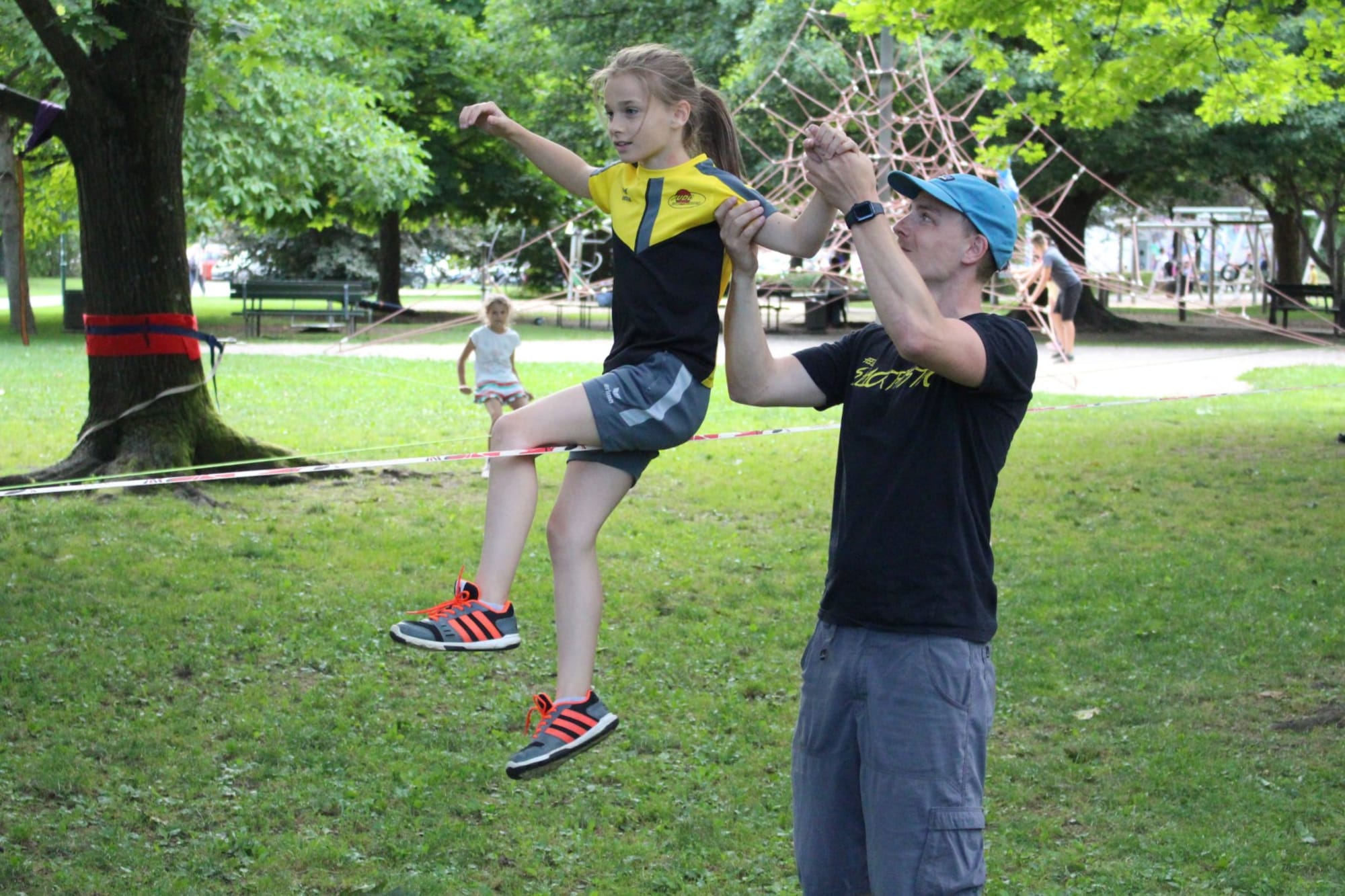Unter den super Anleitungen von Andreas Erschen und Florian Zschätzsch wurden wir in die Kunst des Slacklinens eingeführt. Dies gilt als Trendsportart, bei der man auf einem Gurtband balanciert, das zwischen zwei Befestigungspunkten gespannt ist. Mit viel Elan und Mut wurden sämtliche Lines mit mehr oder weniger Erfolg getestet. Seht euch einfach die Bilder dazu an.