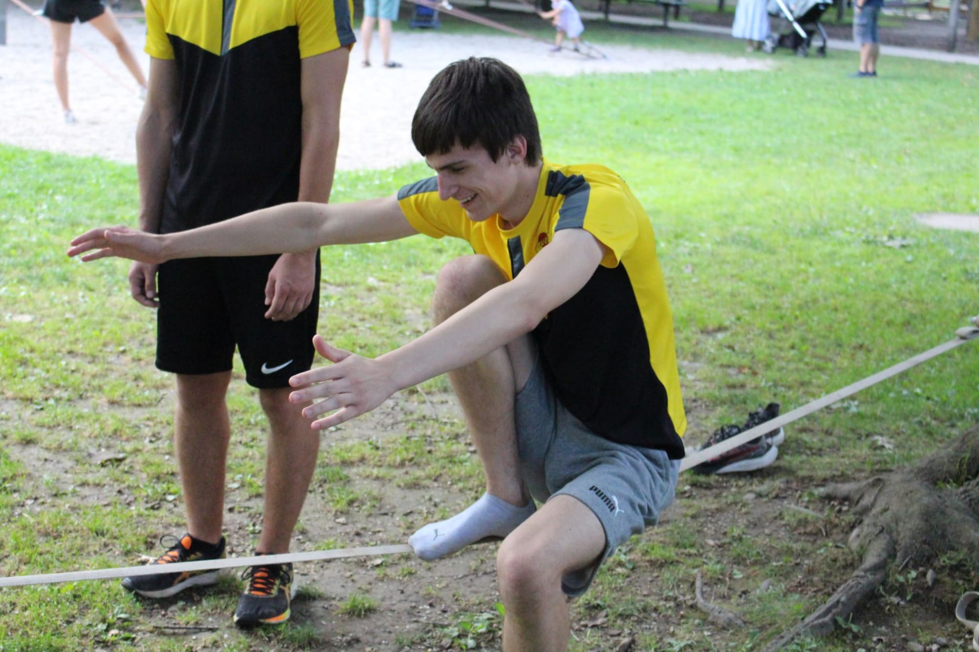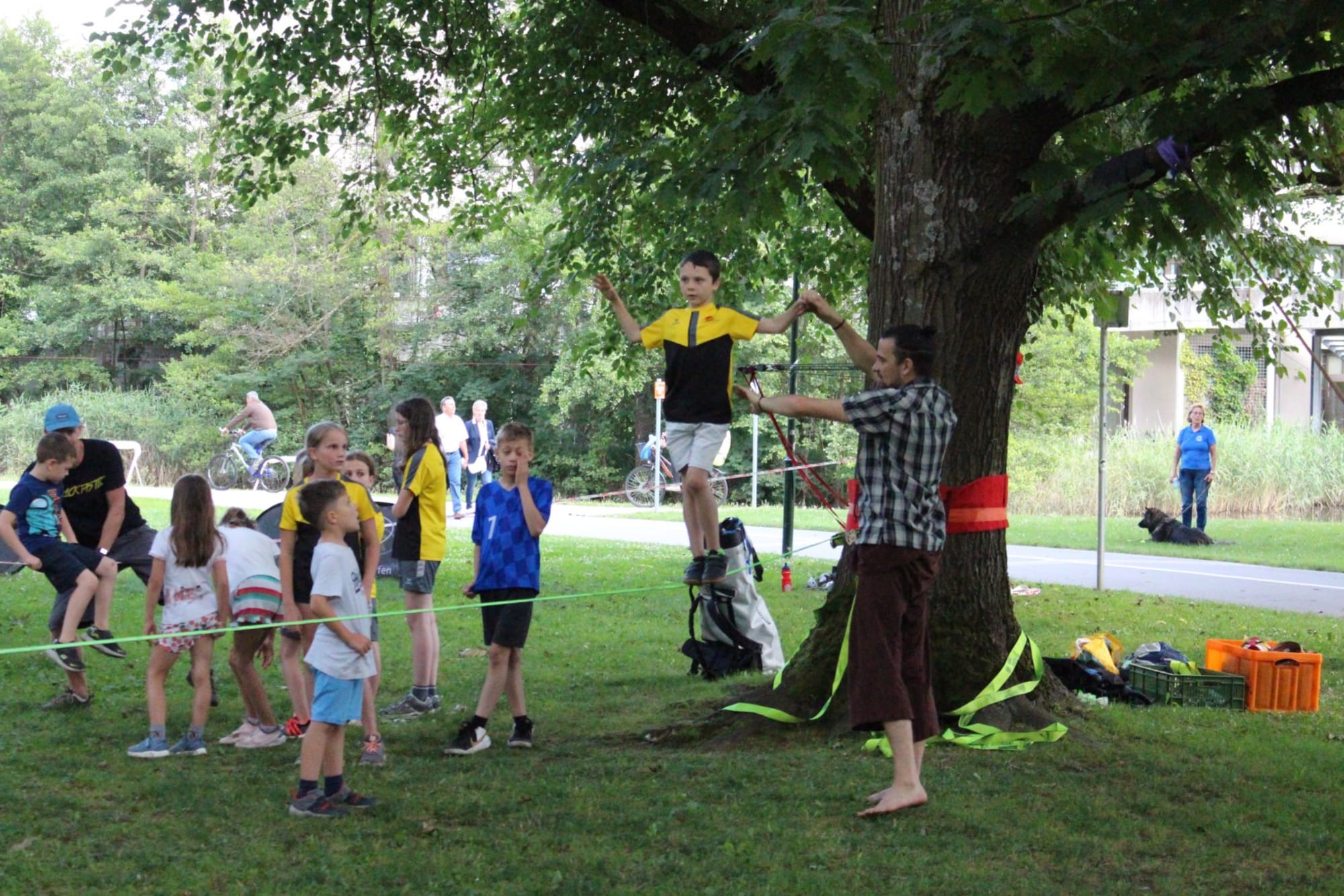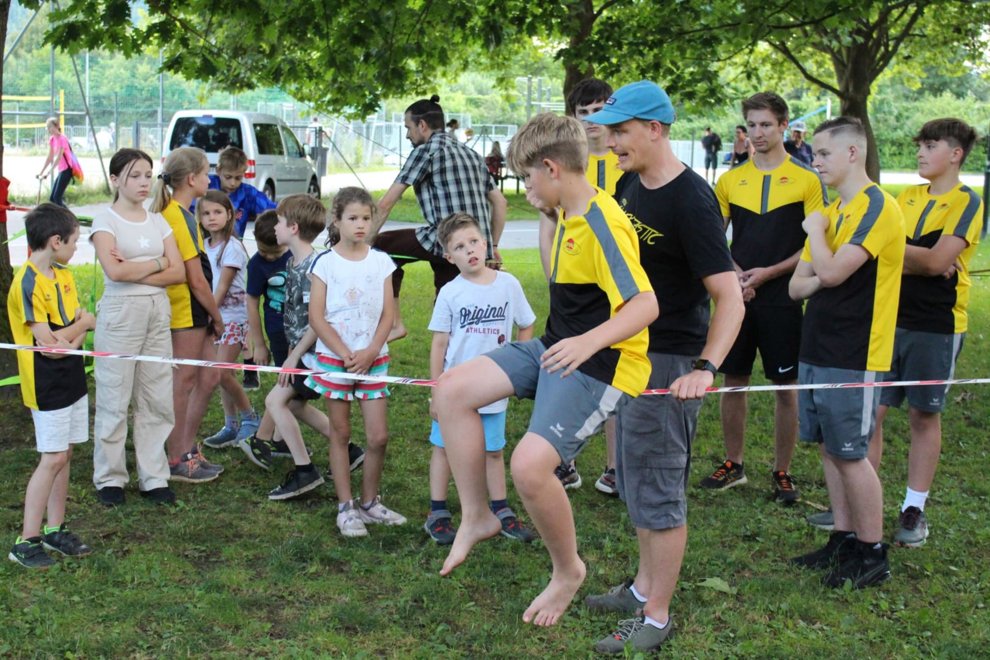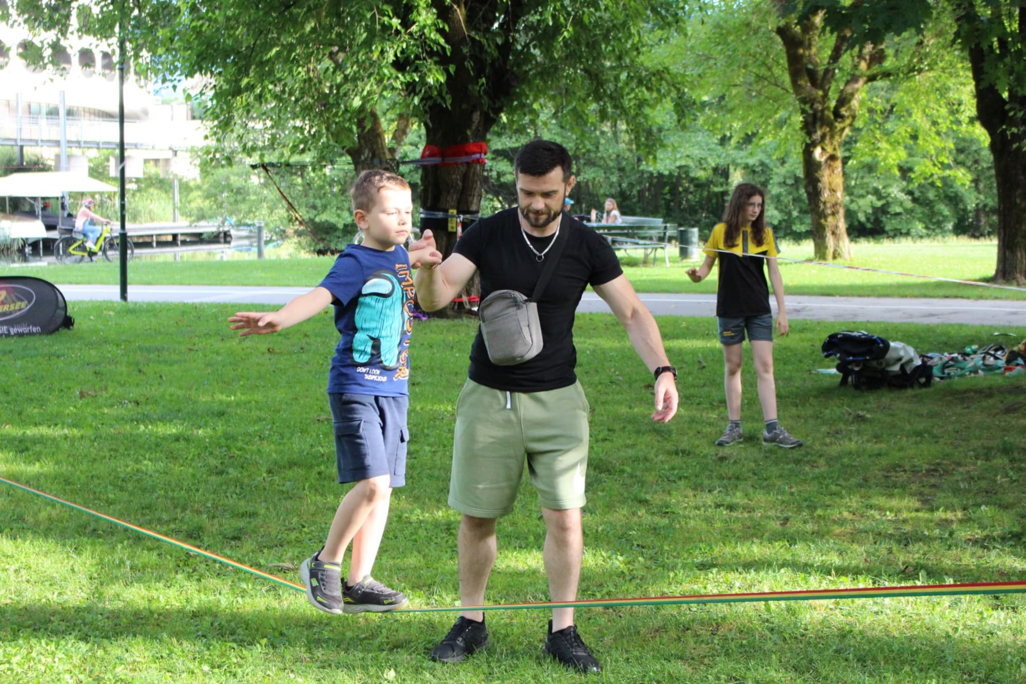 Unter den super Anleitungen von Andreas Erschen und Florian Zschätzsch wurden wir in die Kunst des Slacklinens eingeführt. Dies gilt als Trendsportart, bei der man auf einem Gurtband balanciert, das zwischen zwei Befestigungspunkten gespannt ist. Mit viel Elan und Mut wurden sämtliche Lines mit mehr oder weniger Erfolg getestet. Seht euch einfach die Bilder dazu an.