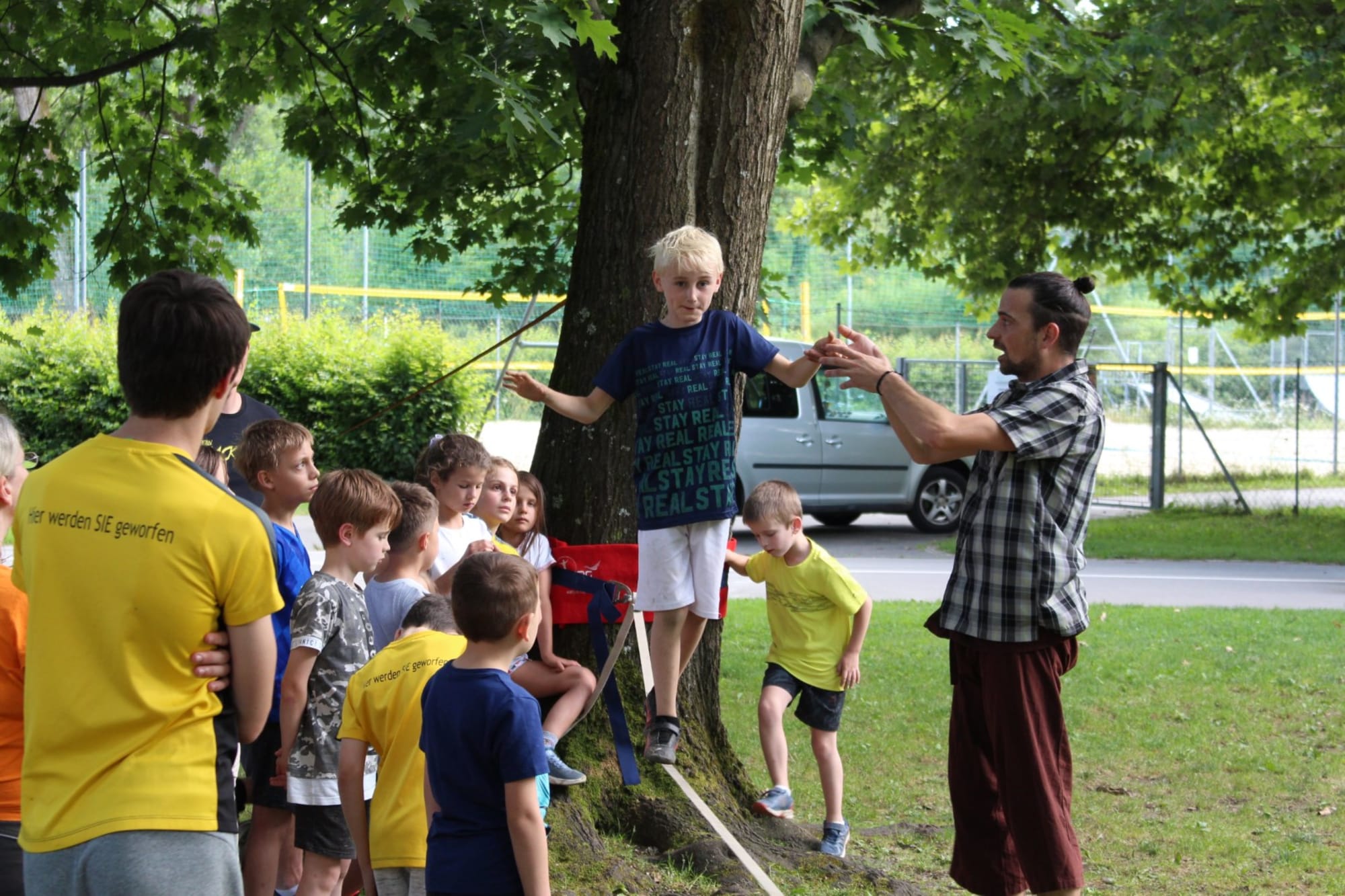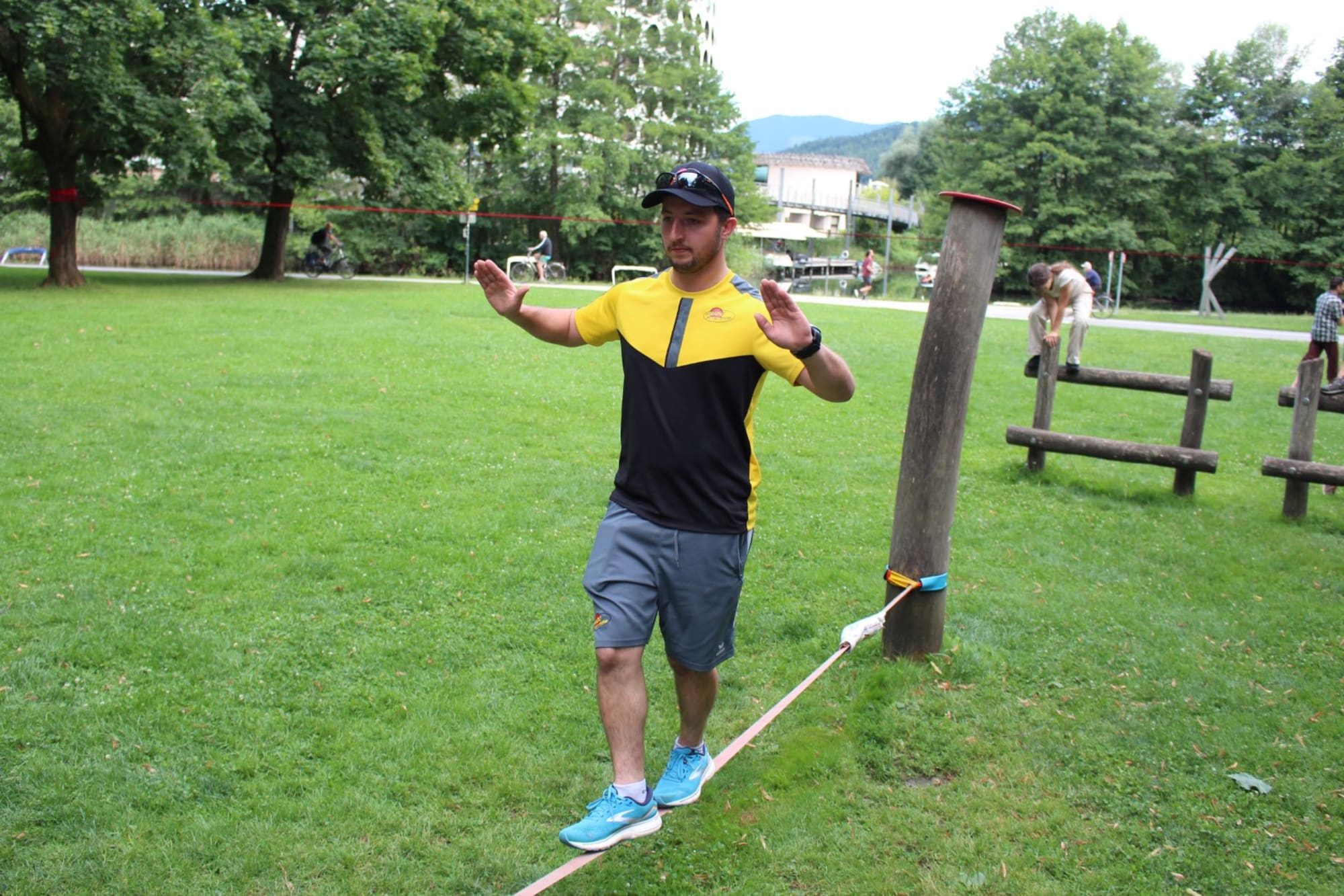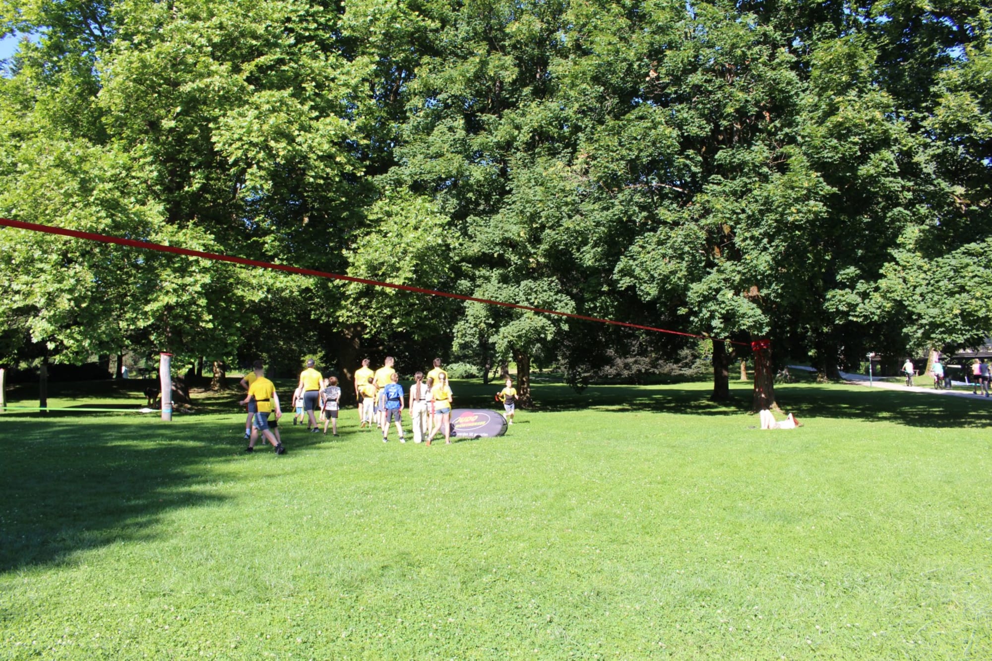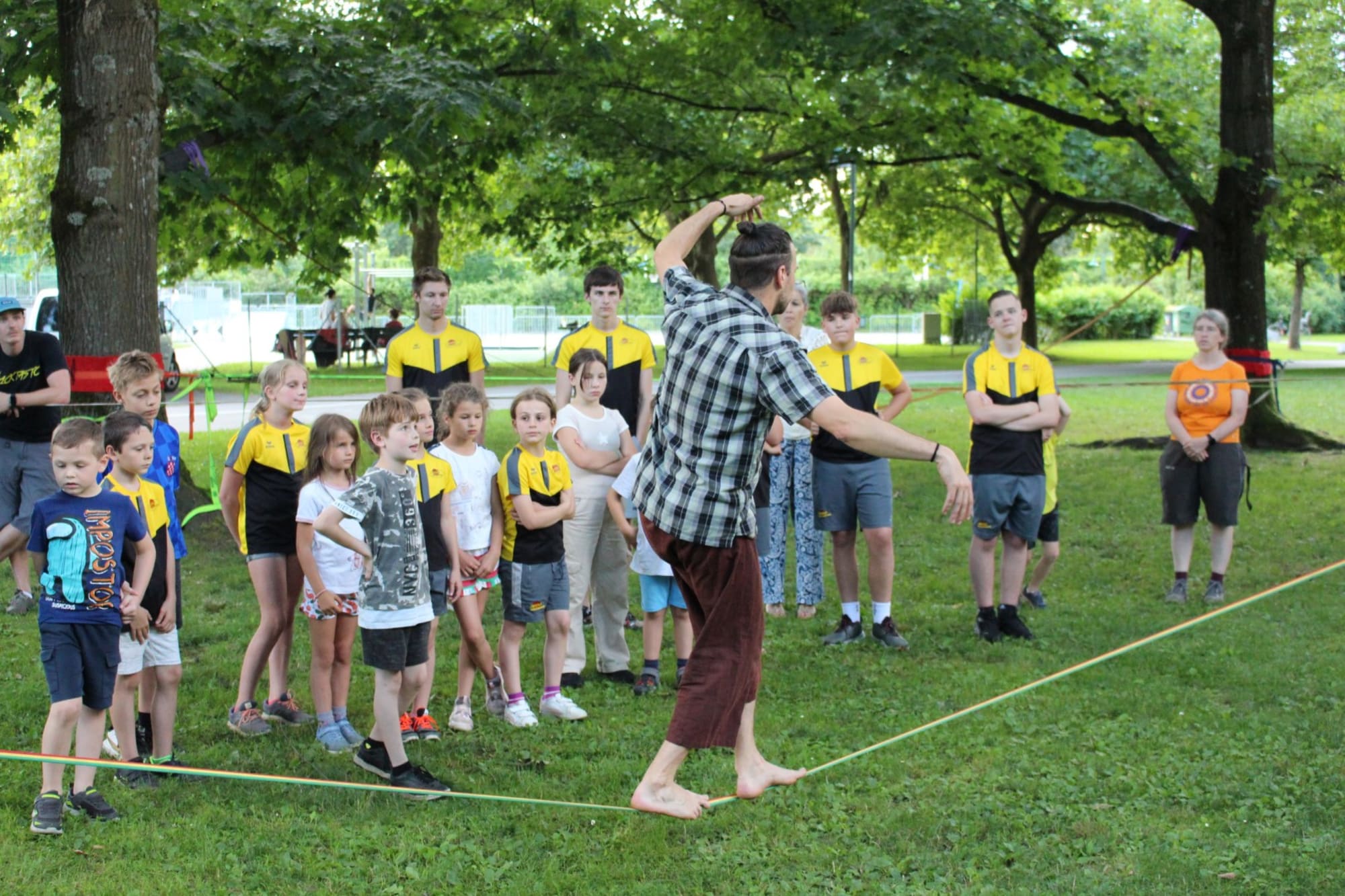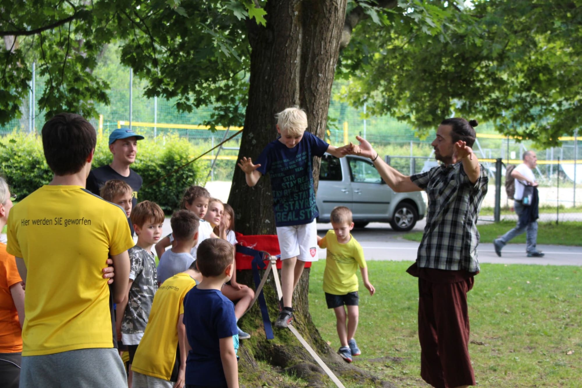 Unter den super Anleitungen von Andreas Erschen und Florian Zschätzsch wurden wir in die Kunst des Slacklinens eingeführt. Dies gilt als Trendsportart, bei der man auf einem Gurtband balanciert, das zwischen zwei Befestigungspunkten gespannt ist. Mit viel Elan und Mut wurden sämtliche Lines mit mehr oder weniger Erfolg getestet. Seht euch einfach die Bilder dazu an.